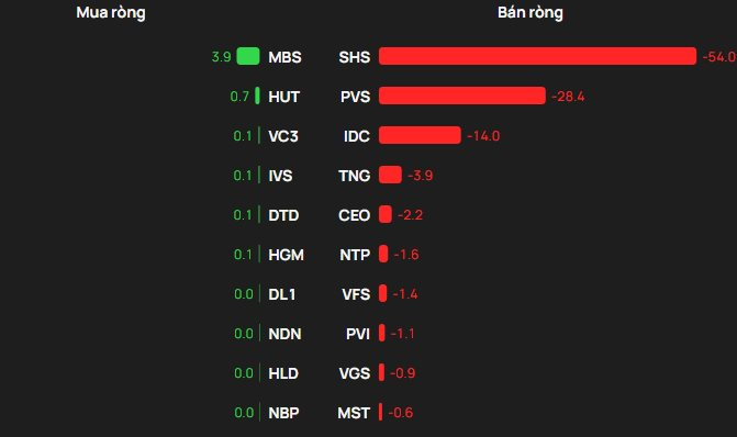 Chiều mua, khối ngoại mua ròng mạnh nhất là MBS (4 tỷ đồng), theo sau là HUT (1 tỷ). Bên cạnh đó, các mã gồm VC3 (0,1 tỷ), IVS (0,1 tỷ) và DTD (0,1 tỷ) cũng được giải ngân nhẹ.