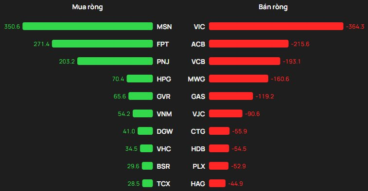 Chiều mua, khối ngoại mua ròng áp đảo ở MSN với khoảng 351 tỷ đồng, theo sau là FPT (271 tỷ) và PNJ (203 tỷ). Các mã HPG (70 tỷ) và GVR (66 tỷ) cũng được mua ròng đáng kể trong top 5.
