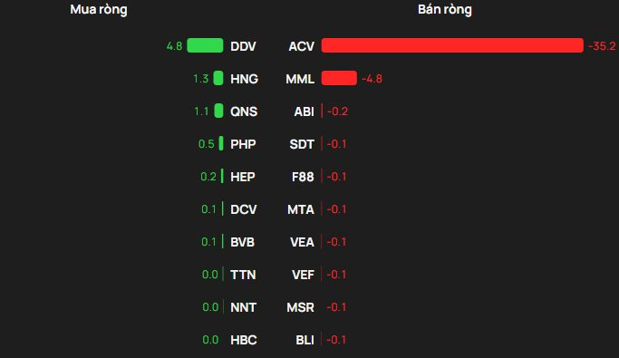 Ở chiều ngược lại, áp lực bán ròng dồn mạnh vào ACV với khoảng 35 tỷ đồng, bỏ xa phần còn lại. Xếp sau là MML (5tỷ), rồi ABI (0,2 tỷ); các mã SDT (0,1 tỷ) và F88 (0,1 tỷ) nằm trong nhóm bị bán ròng tiếp theo.